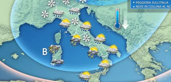 Si verificheranno episodi di pioggia e neve, la quale scenderà a 1.000 metri di quota nel Nord Est e 1.200 nel Nord Ovest.Questa perturbazione nel corso di questi due giorni scenderà verso il sud, abbattendo nel Centro Sud un vortice di bassa pressione nella giornata di domenica. Il maltempo del fine settimana peggiorerà ulteriormente fino ad ottenere un clima da pieno inverno.