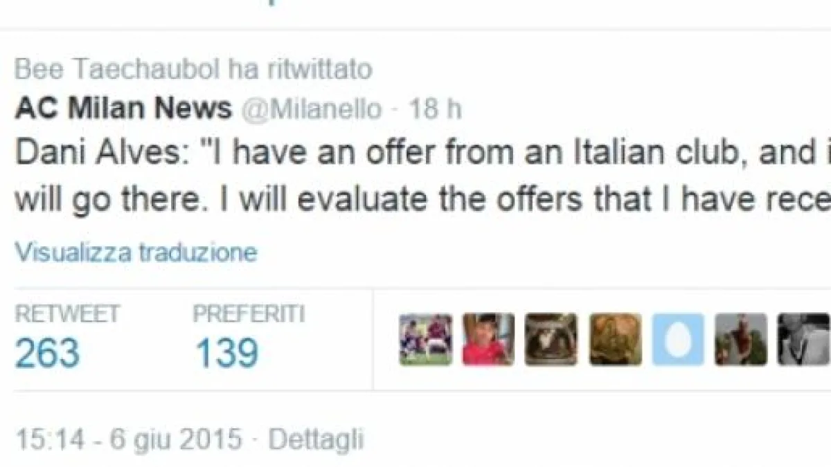 Ebbene, il futuro proprietario del 48% del Milan, Bee Taechaubol, ha retwittato quanto pubblicato dal profilo AC Milan News, che va così recitando: "Dani Alves: ho un'offerta da un club italiano, ed è possibile che andrò lì. Valuterò le ho offerte che ho ricevuto". Insomma, un episodio importante che risulta come un ulteriore riscontro positivo in merito al reale interessamento su Dani Alves da parte del Milan e per la concreta possibilità che il brasiliano vesta rossonero la prossima stagione.