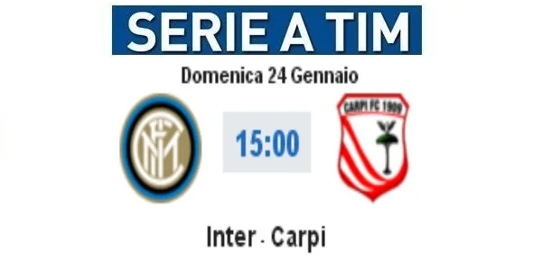 Alle 15.00 di oggi, domenica 24 gennaio 2016, seguiremo la diretta di Inter - Carpi, su questa pagina troverai la cronaca minuto per minuto con aggiornamenti in tempo reale di risultato arricchiti dai video dei gol e gli highlights al termine della partita.