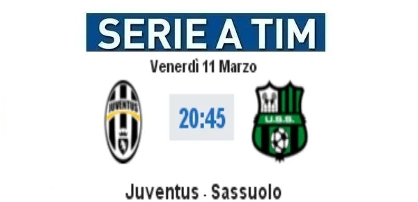 Juventus-Sassuolo, primo anticipo della 29a giornata del massimo campionato italiano, si gioca questa sera, venerdì 11 marzo 2016, con fischio d'inizio alle ore 20.45. Su questa pagina è possibile seguire la diretta del match mediante la nostra cronaca minuto per minuto, video gol live, formazioni ufficiali nel pre-partita e highlights al termine delle ostilità.