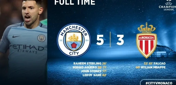 Manchester City-Monaco 5-3: un super Aguero trascina il City alla vittoria