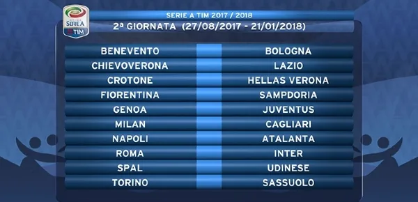 Si proseguirà domenica 27 agosto 2017 alle ore 18.00 con l’incontro tra Torino e Sassuolo, mentre tutte le altre sfide verranno giocate alle ore 20.45. La prima gara casalinga in Serie A del Benevento al Vigorito sarà contro il Bologna. Ci sarà grande emozione e soprattutto una gran folla per questa occasione. In contemporanea ci sarà il battesimo stagionale al Mazza di Ferrara della Spal, che incrocerà l’Udinese. Dopo aver vinto la Serie B la stagione scorsa, gli estensi proveranno a non indossare i panni della cenerentola di turno.