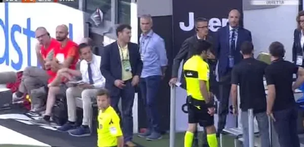 La scena è un misto tra il comico e la tragedia, con l'arbitro, accerchiato dai giocatori che protestano, che cerca di ascoltare quello che gli viene detto via auricolare, mentre in panchina Mihajlovic ride ironicamente per trattenere gli insulti. Come se non bastasse ci sono anche problemi al sistema e il quarto uomo è costretto ad utilizzare un walkie-talkie per far giungere le informazioni. Alla fine, dopo 3 minuti di show, il gioco riprende con la rimessa da parte dell'arbitro (scodellamento in gergo comune).