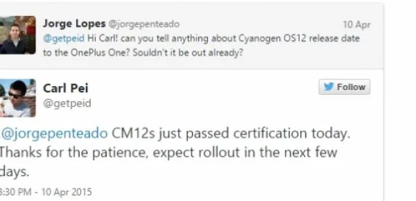 Il Co-fondatore, Carl Pei, su Twitter ha risposto a un utente che la CM12S per il OnePlus One è già passato al processo di certificazione dell'azienda e che il roll-out dovrebbe iniziare entro pochi giorni. In particolare, l'aggiornamento, sarebbe dovuto essere rilasciato entro il 30 marzo, mentre proprio la ROM personalizzata della società basata su Android 5.0 Lollipop, OxygenOS doveva arrivare il 27 marzo. Tuttavia, la società ha mancato entrambe le scadenze e aveva accusato la certificazione come motivo del ritardo.