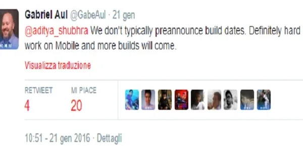 Attualmente, gli utenti Windows Insider hanno a bord la build 10.0.10586.63. Volendo spezzare una lancia a favore di Aul, gli va riconosciuta l'estrema correttezza nei confronti degli utenti, ai quali risponde quasi sempre in maniera esaustiva. Va anche detto che ha ragione quando dice che Microsoft non è solita a lanciare in anteprima le date di rilascio delle build, ma occorre sottolineare che nelle 24 ore che precedono il rilascio delle nuove versioni del sistema operativo è Gabriel Aul in persona, su Twitter, ad annunciare il loro arrivo. Per ulteriori aggiornamenti, se volete conoscere i telefoni Lumia che lo riceveranno per primi, cliccate il tasto 'Segui' in alto a destra.