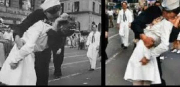 Il simbolo di un Paese, e di un mondo, non più fatto di violenza e guerra, ma di pace e di speranza. La famosa foto fu scattata da Alfred Eisenstaedt e pubblicata su Life, rivista che però non venne mai a conoscenza delle reali identità dei due giovani, i cui volti appaiono solo in maniera parziale. La "caccia" ai nomi dei protagonisti finì nel 2007, quando, dopo anni in cui in tanti si presentarono e spacciarono come il "marinaio del bacio", si identificò il giovane della foto con Glenn McDiffie. L'ex marinaio ha sempre rivendicato di essere effettivamente il giovane protagonista della foto, come raccontato allo Houston Chronicle durante un'intervista degli anni Ottanta: "non ho mai creduto che potesse darmi pubblicità, ma mi faceva diventare pazzo il fatto di non essere riconosciuto in quell'immagine".