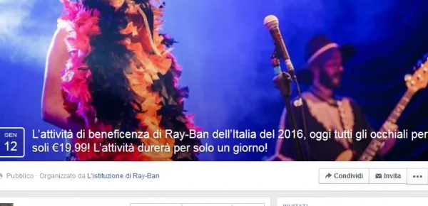 Gli iniviti che stanno circolando su Facebook sono più di uno e risultano organizzati da "Istituzione di Ray-Ban". Se in queste ore ricevete notifiche su Facebook e inviti (anche da amici) per eventi sospetti riguardanti campagne promozionali di beneficenza, diffidatene. Se semplicemente aprite il link dell'evento non succederà nulla né al vostro account né al vostro dispositivo. Quel che è da evitare assolutamente è di indicare la partecipazione all'evento o di cliccare su i link presenti.