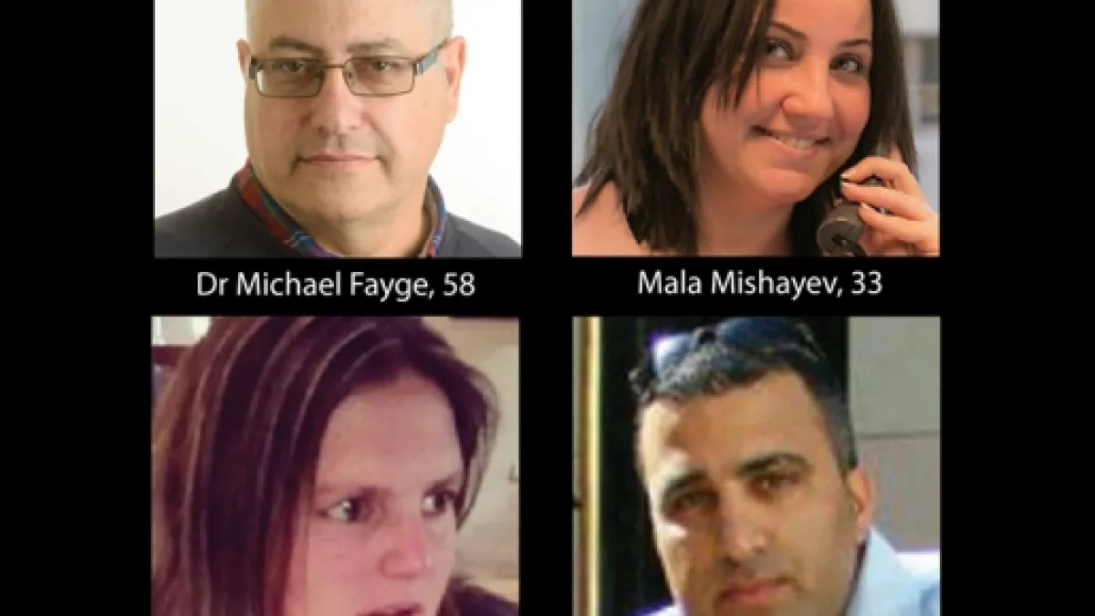 Le persone che hanno perso la vita sono (da sinistra in alto nella foto): Michael Feige, 58 anni, di Ramat Gan, periferia est di Tel Aviv; Mila Mishayev, 32 anni, di Ashkelon; Ilana Neve, 39 anni, di Tel Aviv, ed Ido Ben Ari, 42 anni, di Ramat Gan.