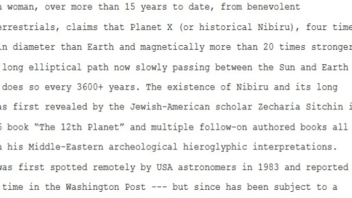“Nibiru è 4 volte più grande della Terra, magneticamente 20 volte più forte. Si tratta di un lungo percorso ellittico che il pianeta percorre ogni 3600 anni. Nibiru fa parte di un grosso insabbiamento governativo. Ma le immagini sono su molti siti web. La forza magnetica del pianeta sta già dando i primi risultati e sembra essere la causa dei cambiamenti climatici”, si legge nell’email.