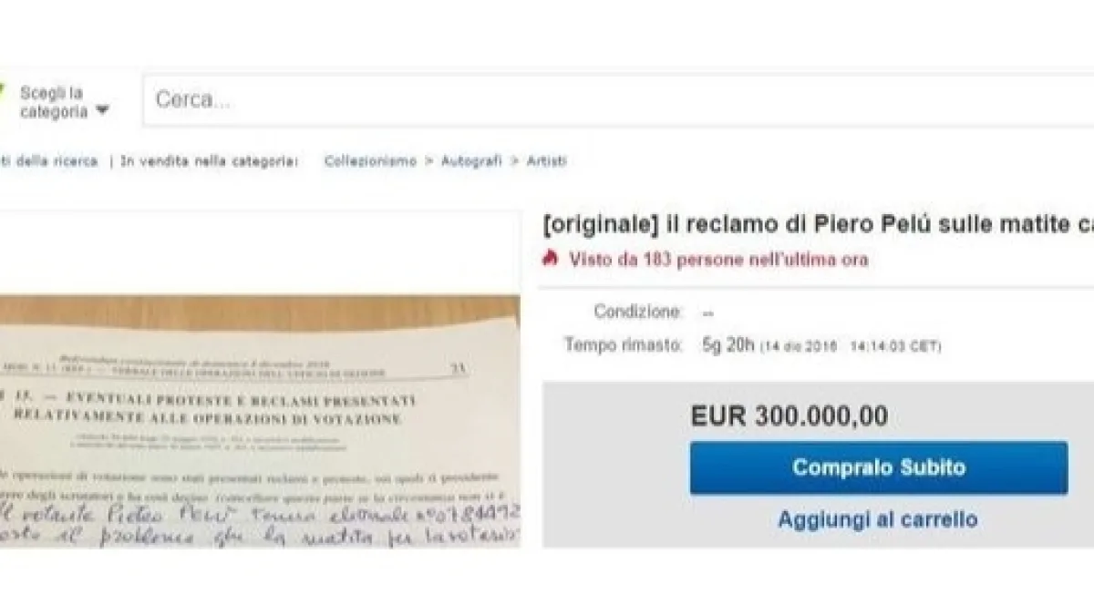 Con queste parole è apparso ieri sulle pagine del famosissimo sito di vendite online Ebay la pubblicazione ufficiale del reclamo. Tutto regolare, tranne il prezzo. Ben 300.000 euro per il pezzo di carta più conosciuto del voto referendario. Intanto la piattaforma dopo aver effettuato i controlli di rito ha accettato e ha suggerito al venditore di aggiungere l'accattivante frase “Prezzo trattabile”.
