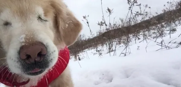 Il cane scodinzola e sembra davvero divertirsi e godersi un momento di meritato relax, incoraggiato dal padrone ad approfittare della neve appena caduta.
