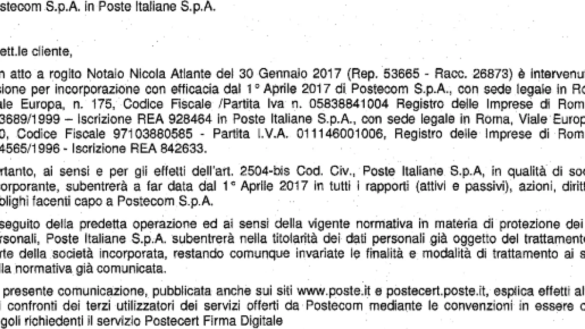 In questi giorni tanti italiani (privati, aziende, professionisti, associazioni) stanno ricevendo a casa una comunicazione di Poste Italiane S.p.A, sotto forma di lettera Raccomandata, in cui si comunica che, dal primo aprile 2017 diventerà titolare di tutti i rapporti intrapresi dall'accorpata Postecom, a seguito di una fusione per incorporazione dello scorso 30 Gennaio, compresi i rapporti di gestore delle PEC.