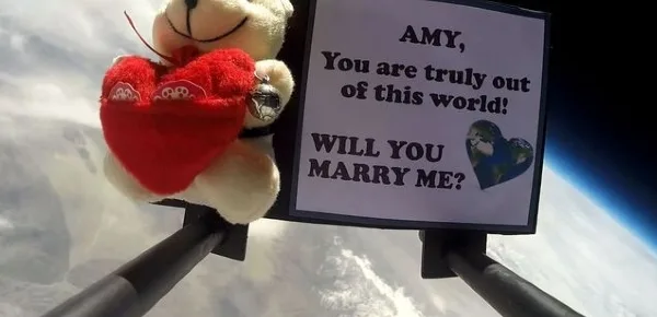 È di una coppia di giovanissimi fidanzati americani, l'idea di scambiarsi un messaggio d'amore che superi tutti i confini: oltre, addirittura, l'atmosfera terrestre. Grazie all'invio del "Cupido peloso", un orsetto di peluche bianco con un cuoricino sul pancino, nel cosmo su un pallone sonda, il giovane Erik Rasmussen, dell'Oregon, ha rivolto la domanda più attesa e desiderata da ogni fidanzata: "mi vuoi sposare?".