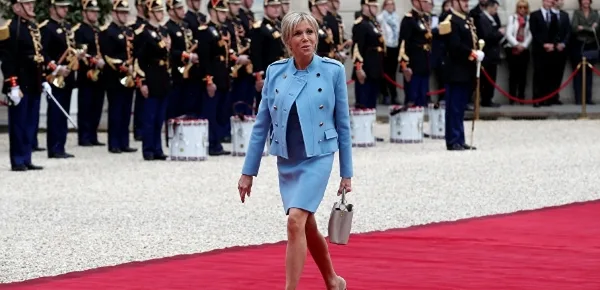 L'abito di Brigitte, che è la signora Macron dal 2007, era di un colore più carico di quello della first lady Usa e più "trasgressivo". Oltre alla giacca simil militare a doppia abbottonatura, aveva un tubino che ha lasciato le gambe ben in vista. Capelli raccolti in un morbido chignon, è apparsa sicura e sorridente nel salire le scale di ingresso all'Eliseo e ha salutato come una diva consumata. Accolta dalla moglie del segretario generale dell'Eliseo, Jean Paul Jouyet, si è poi ricongiunta al marito per le foto di rito. Presente tutta la famiglia, i tre figli di lei, Laurence e Sebastien e Tiphaine, che sono coetanei del marito presidente, e i sette nipoti. All'Eliseo, parola di Macron che l'ha detto in una intervista prima di diventare presidente, ha fatto il suo ingresso non una coppia normale, ma una coppia reale.