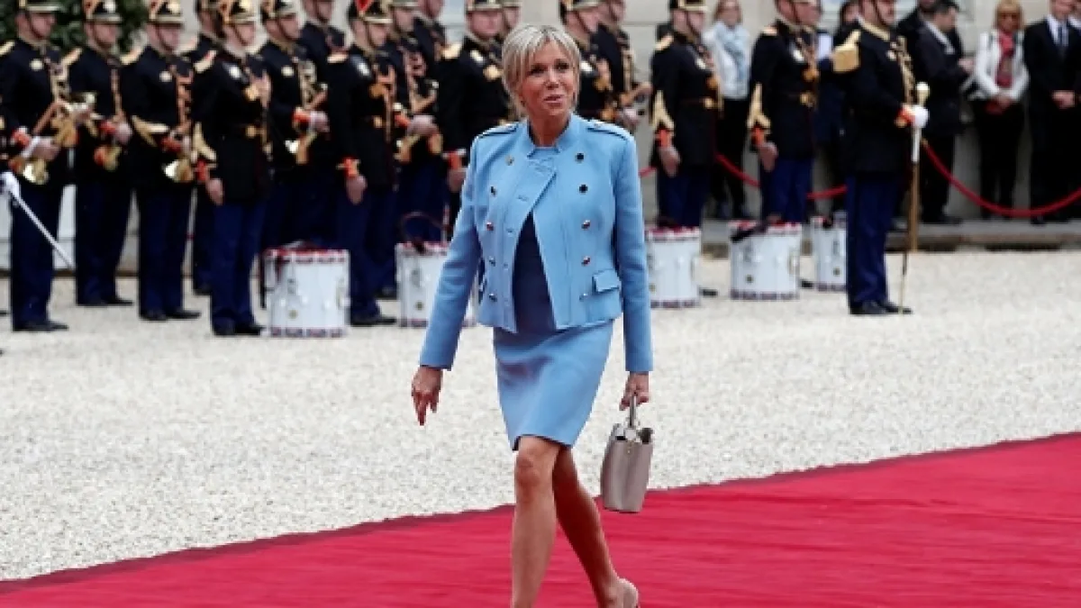 Tutta d'azzurro vestita. Proprio come Melania alla cerimonia dell'insediamento alla Casa Bianca del marito, Donald Trump. Ha scelto un tailleur celeste, Brigitte Trogneux, per insediarsi all'Eliseo con il marito Emmanuel Macron, il più giovane neo presidente della Francia. Il completo le è stato "prestato" per l'occasione dalla maison Louis Vuitton.