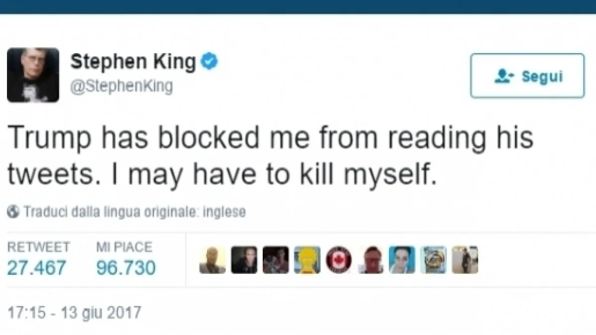 Lo scrittore, noto per essere sarcasticamente ironico ha risposto via tweet alla mossa poco elegante dell'attuale Presidente degli Stati Uniti, scrivendo: "Trump mi ha bloccato dal leggere i suoi tweet. Potrei uccidermi." Proprio lui che di uccisioni, misteri e cimiteri viventi ne ha fatta una ragione di vita, ha deciso - ironicamente - di porre fine alla sua esistenza perché Trump pare non avere senso dell'umorismo, o meglio, non ama le critiche.