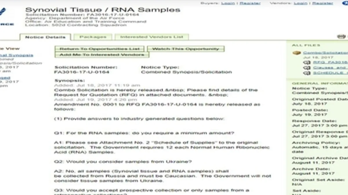 US Air Force (Aeronautica militare USA) ha indetto una gara d’appalto per la fornitura di tessuto sinoviale e dei campioni dell’RNA di origine russa, di etnia europea, bianchi e sani. I campioni devono essere prelevati dai donatori in Russia. Non si accettano campioni provenienti dall’Ucraina. L’unità dell’Aeronautica che ha indetto la gara d’appalto si trova a Lackland, Texas, e si occupa di addestramento del personale di volo e dei tecnici.