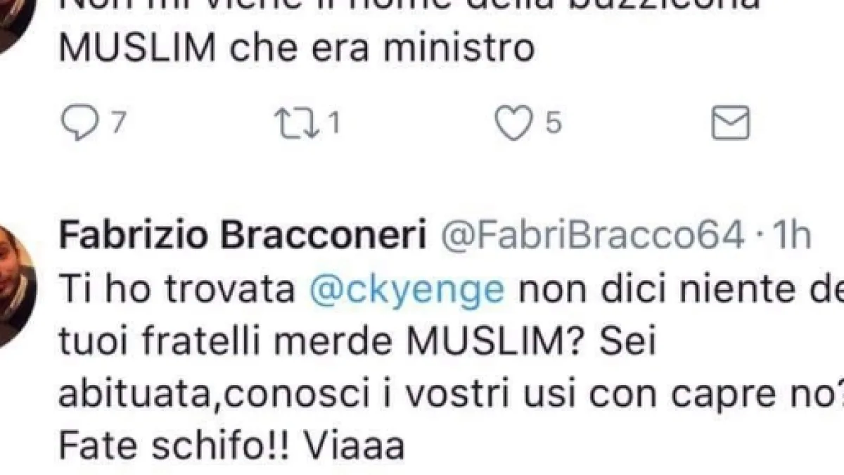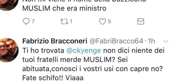 Riferendosi alla Kyenge, Bracconeri aveva scritto sul social dei cinguettii: 'Non mi viene il nome della buzzicona Muslim'. Il post osceno e oltraggioso era stato subito dopo rimosso dal team di Twitter, insieme a un altro tweet altrettanto offensivo. Poi è arrivata la sospensione dell'account.