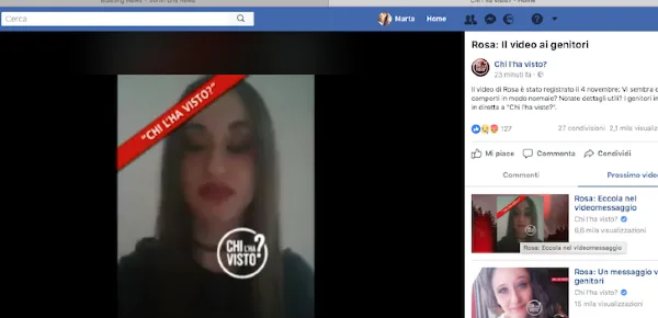 Il video di Rosa, inviato ai genitori, parrebbe essere del 4 novembre 2017, almeno così dice la ragazza nella registrazione, aggiungendo che sta bene. È arrivato sul cellulare di Luigi, il papà di Rosa, da un numero che non può essere rintracciato. Subito la conduttrice Federica Sciarelli fa notare che Rosa non si rivolge ai genitori direttamente ma sembra essere in stato di prigionia o comunque esprimersi con parole dettate.