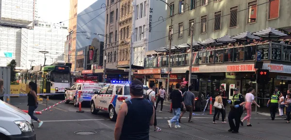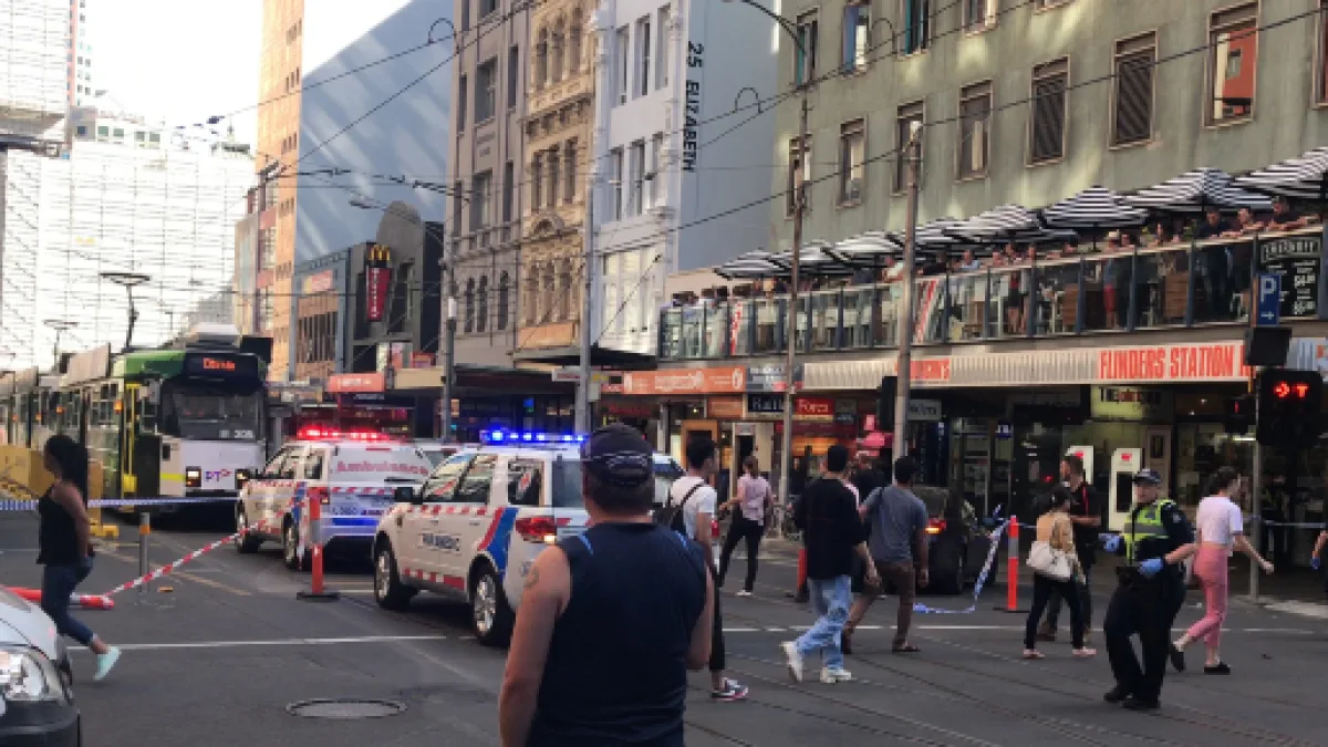 L'auto si fermerà schiantandosi contro la fermata del bus, sui binari, su Flinders Street, subito avvolto dalla gente che gli fa da scudo.