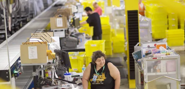 Del grande colosso amazon si parla non solo per la sua rinomata attività di maggior distributore on-line, ma anche per la robotizzazione dei suoi dipendenti, malpagati, e costretti a velocizzare il proprio lavoro per rientrare nella "linea" standard dell'azienda. Il loro lavoro è frustrante, sempre lo stesso, ed avviene con l'ausilio di veri "robot".