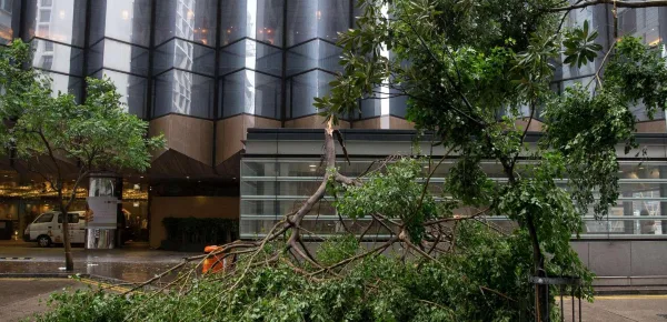 Dopo aver colpito le Filippine, il tifone Mangkhut ha perso potenza ed è stato classificato di categoria 4 ma ha comunque proseguito la propria corsa in direzione della Cina meridionale e ha trovato sul suo percorso la città di Hong Kong. Qui si è abbattuto con forza minore, ma comunque sufficiente a sradicare alberi e mandare in frantumi i vetri dei grattacieli. L'osservatorio metereologico di Hong Kong ha registrato raffiche di vento a più di 240km/h ed è stato necessario disporre l'annullamento dei voli e la chiusura dell'aeroporto almeno fino a martedì prossimo. La popolazione dal canto suo ha cercato di proteggersi schermando le porte e le finestre delle abitazioni e centinaia di sacchi di sabbia sono stati posizionati a protezione del lungomare.