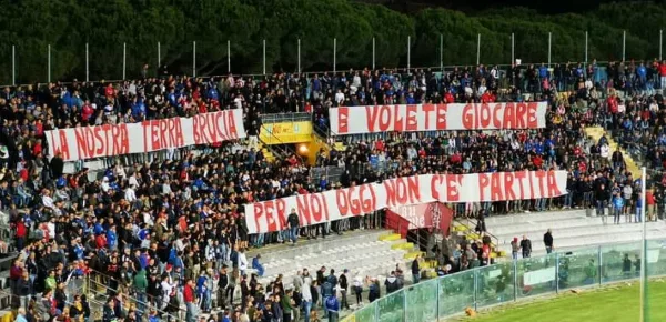 Pochi attimi dopo è comparsa la risposta degli ultras della curva Nord pisana: due striscioni con sopra scritto 'la nostra terra brucia e volete giocare, per noi oggi non c’è partita'. Dopo 14 minuti sono usciti dall’Arena lasciando il centro della curva deserto.