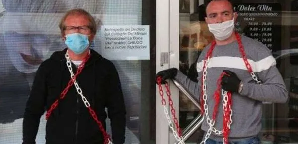 A seguito della notizia della riapertura del loro locale solo al 1 giugno, Agostino Da Villi e Stefano Torresin, titolari de 'La Dolce Vita', situato in Corso Milano a Padova, hanno messo in atto una vera e propria contestazione pubblica legandosi con una catena alla porta d'ingresso dell'esercizio commerciale, indossando, tuttavia, la mascherina obbligatoria. L'atto dimostrativo deriva sia dalla data fissata per il ritorno all'attività lavorativa, sia per le spese che, mensilmente, i due titolari si trovano a dover pagare, cosa che in queste condizioni, con il locale che continuerà a rimanere chiuso fino a giugno, risulta sempre più difficile da ottemperare: 'Abbiamo 20.000 euro di spese fisse al mese e ci danno 600 euro?' reclamano i due uomini, facendo trapelare tutto il loro disappunto sulle decisioni attuate dal Governo.