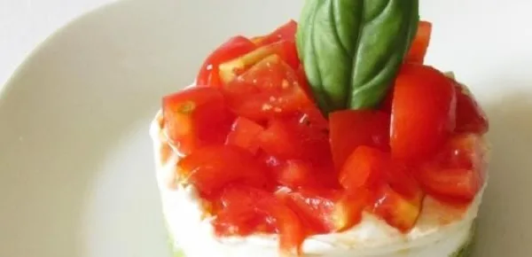 240 grammi di formaggio fresco spalmabile freddo, uno spicchio d'aglio tritato, rosmarino a piacere, un cucchiaino di sale, due cucchiai di olio d'oliva, 40 grammi di rucola fresca, 30 cl di panna fresca da montare, 3 fogli di colla di pesce, 2 albumi d'uovo.
