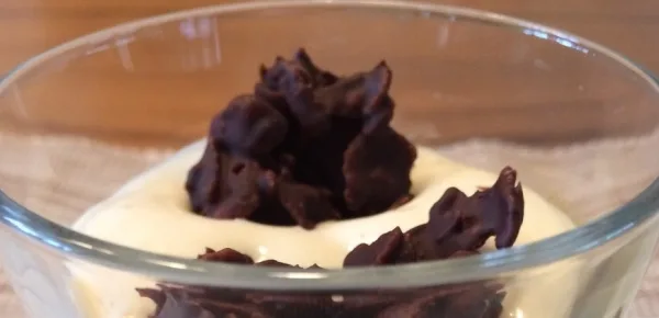 Quando sarà fuso prendete 6 cucchiai di corn flakes (come sempre scelti tra i prodotti consentiti ai celiaci) o della frutta secca e uniteli nel pentolino al cioccolato. Con l'aiuto di due cucchiai preparate delle palline o dei riccioli da far raffreddare e adagiare sui bicchierini prima di servirli.