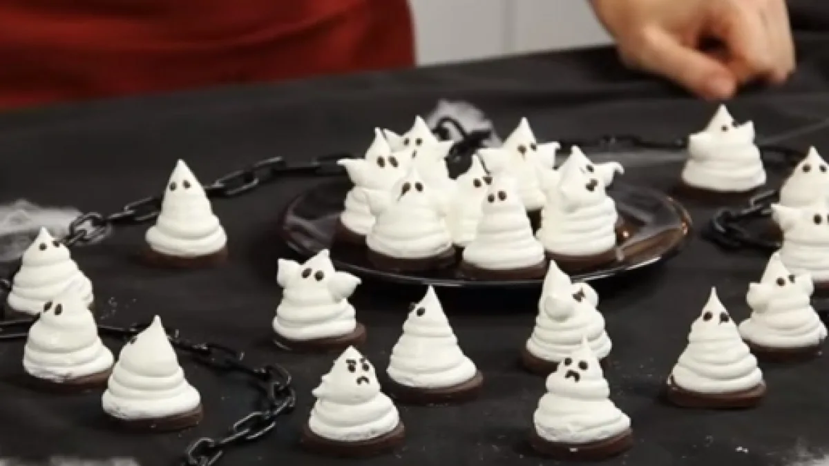 Passate ora a montare le uova, aiutandovi con un pizzico di sale. Dovrete ora aggiungere sia lo sciroppo precedente sia la colla di pesce e mescolate lentamente. Che cosa resta da fare ora? Il composto che si è creato dovrà essere messo in una sacca. Prendete ora un foglio di carta da forno e realizzate, muovendo la bocca della sacca in senso circolare, delle piramidi. Abbiamo quasi finito. L'ultima cosa che vi resta da fare per la preparazione è sciogliere il cioccolato a bagnomaria e, come fatto in precedenza con i cake pops, utilizzare degli stecchini per gli occhi e la bocca di tutti i fantasmi che vorrete. Prima di mangiarli lasciateli in frigo per circa 3 ore.