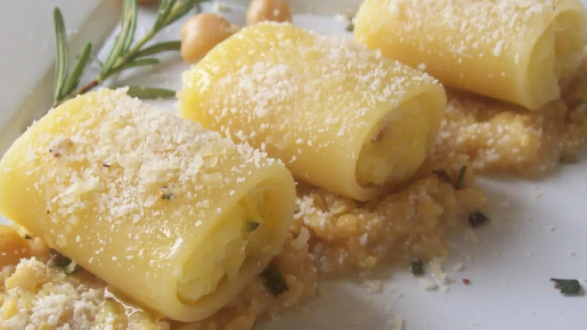 La calamarata ricotta e gelato al taleggio è una ricetta raffinata e gustosissima da servire in tavola per stupire ospiti o parenti durante un'occasione speciale. In essa un letto di crema di patate accoglie una pasta farcita con la ricotta, mentre il gelato al taleggio e il crumble di pangrattato e zucchero completano questo piatto favoloso.