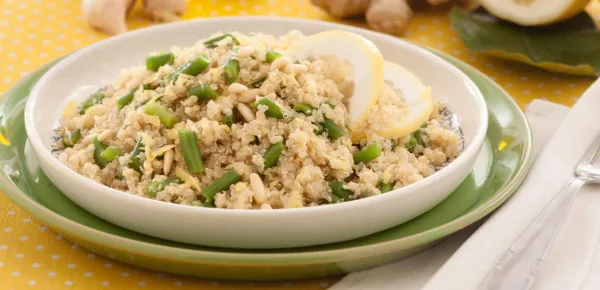 La quinoa al pesto di fagiolini con zenzero e limone è un piatto saporito e leggero, perfetto anche per chi vuole evitare la pasta o è allergico al glutine. La ricetta prevede, infatti, l'utilizzo di questo alimento salutare ricco di grassi insaturi, di fibre e sali minerali, quindi benefico per l'intestino. Altamente digeribile, il sapore ricco di questa pietanza non passa di certo inosservato e sarà possibile portare in tavola questa ricetta coloratissima anche durante un pranzo trascorso all'aria aperta.