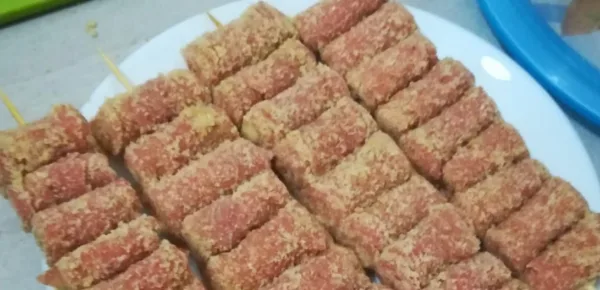 Adagiare sopra ognuna di esse qualche listarella di galbanino e di prosciutto cotto, avvolgendole su loro stesse ottenendo degli involtini. Fermarle con uno stecco e infilzare ogni spiedo con circa 8-9 braciole.