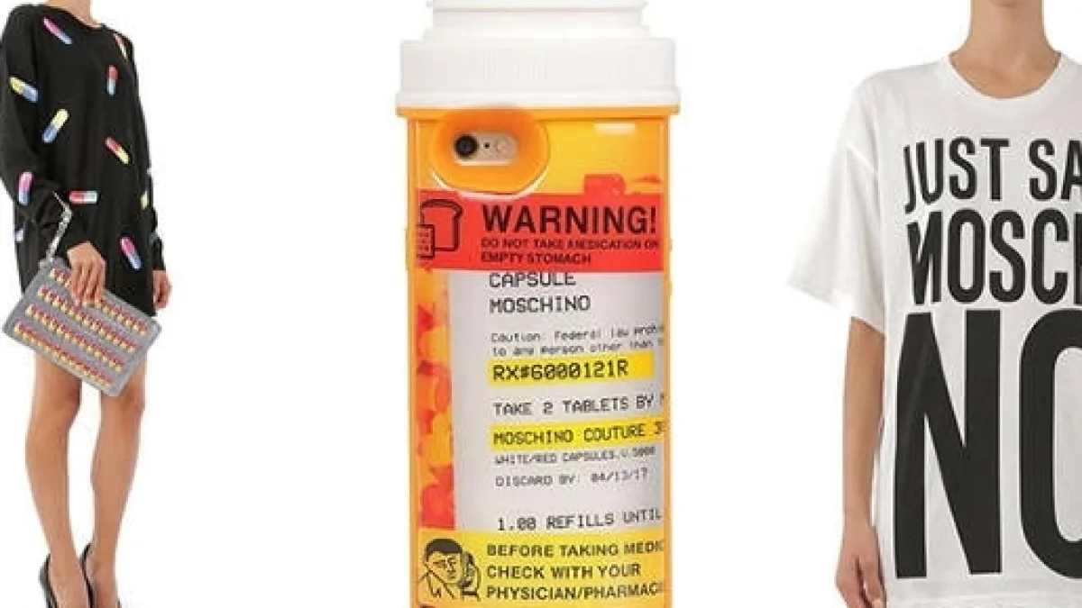 L'ultima capsule di Jeremy Scott per Moschino sta scatenando un putiferio. Gli abiti della collezione primavera-estate con i disegni di non ben identificate pillole (396 sterline, o $ 492), le borse recanti le stampe di bottigliette di medicinale (545 sterline, o $ 677), le clutch disseminate di compresse (462 sterline, o $ 574) e ancora, i top con le avvertenze delle interazioni farmacologiche (594 sterline, o $ 798), hanno attirato l'attenzione di Randy Anderson, consulente del settore moda uomo presso l' Eden House Recovery Services di Minneapolis.
