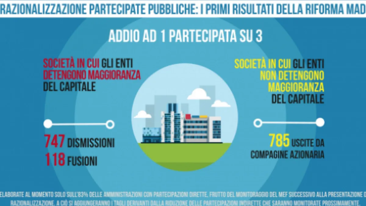 Dalla ricognizione delle partecipazioni delle Pubbliche amministrazioni emerge un dato significativo: una su tre è interessata da interventi di dismissione. La ricognizione, di carattere straordinario, si è conclusa nelle scorse settimane, in prossimità della data stabilita per la comunicazione dei piani di razionalizzazione al ministero dell'Economia. Complessivamente sono oltre 30 mila le partecipazioni societarie che sono state dichiarate da PA, tutte riconducibili a poco meno di 6 mila società.