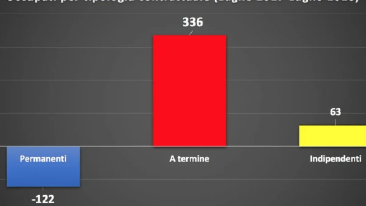 Questi ultimi tre dati c'introducono a quello che è niente altro che la conferma dei mutamenti epocali in atto nel mondo del lavoro. Infatti, se prendiamo in esame i dati anno su anno, vediamo che da luglio 2017 a luglio 2018 abbiamo avuto 277.000 occupati in più. Ma attenzione alla composizione di tale numero: esso e la risultante di 336.000 nuovi contratti a termine, di 86.000 nuovi liberi professionisti, che si sommano ai -122.000 contratti a tempo indeterminato che sono spariti dal mondo del lavoro.