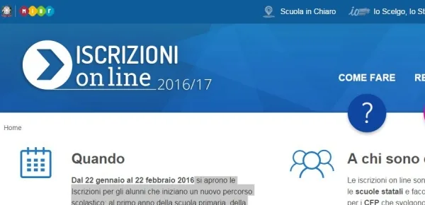 Come già a decorrere dall'anno scolastico 2012/2013, le iscrizioni alle prime classi delle elementari, medie e superiori avvengono online. Esse in modo particolare, sono obbligatorie per le scuole statali e per i Centro di Formazione Professionali Regionale (CFP), invece, sono facoltative per le scuole paritarie. Pertanto gli interessati che dovranno effettuare le iscrizioni alle prime classi, (ad eccezione delle materne dove la domanda resta cartacea) dovranno farla mediante il portale dedicato alle iscrizioni online presente sul sito del Miur.