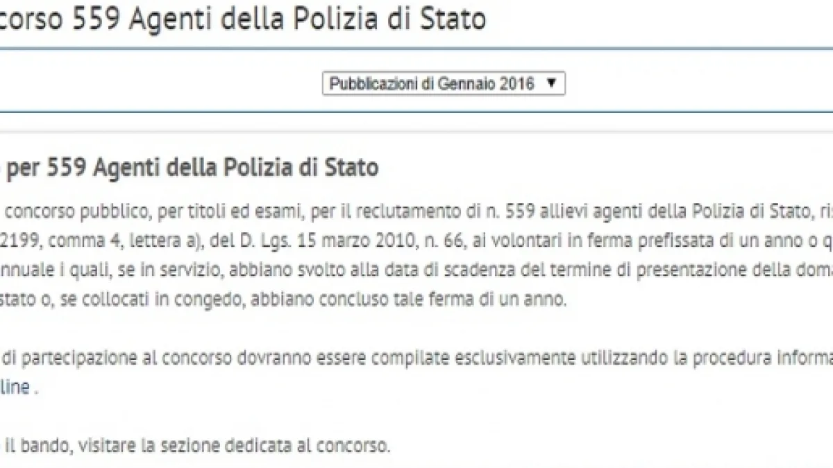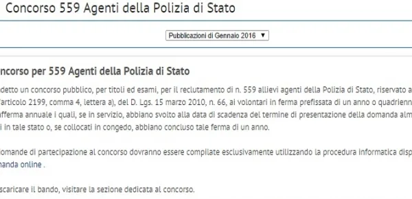 Da qualche giorno è aperto ufficialmente il nuovo concorso di Polizia 2016. Di seguito la data di scadenza per l'invio della domanda, i requisiti e i posti riservati. L'avviso del bando è stato pubblicato sulla Gazzetta Ufficiale 4^ serie speciale, numero 8 del 29 gennaio. Il concorso prevede il reclutamento di 559 Allievi Agenti, ed è riservato ai volontari in ferma prefissata e di un anno o quadriennale.