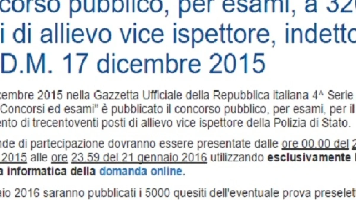 Nuova tappa importante per il concorso di polizia 2016. Nella giornata di domani, martedì 2 febbraio, verranno pubblicati i 5000 quesiti della prova preselettiva, su cui i candidati dovranno allenarsi per presentarsi al meglio alla prima prova. Prima di entrare nello specifico, vi ricordiamo che nei giorni scorsi sulla Gazzetta Ufficiale della Repubblica Italiana è stato pubblicato il bando che prevede l'assunzione di 559 allievi della Polizia di Stato.