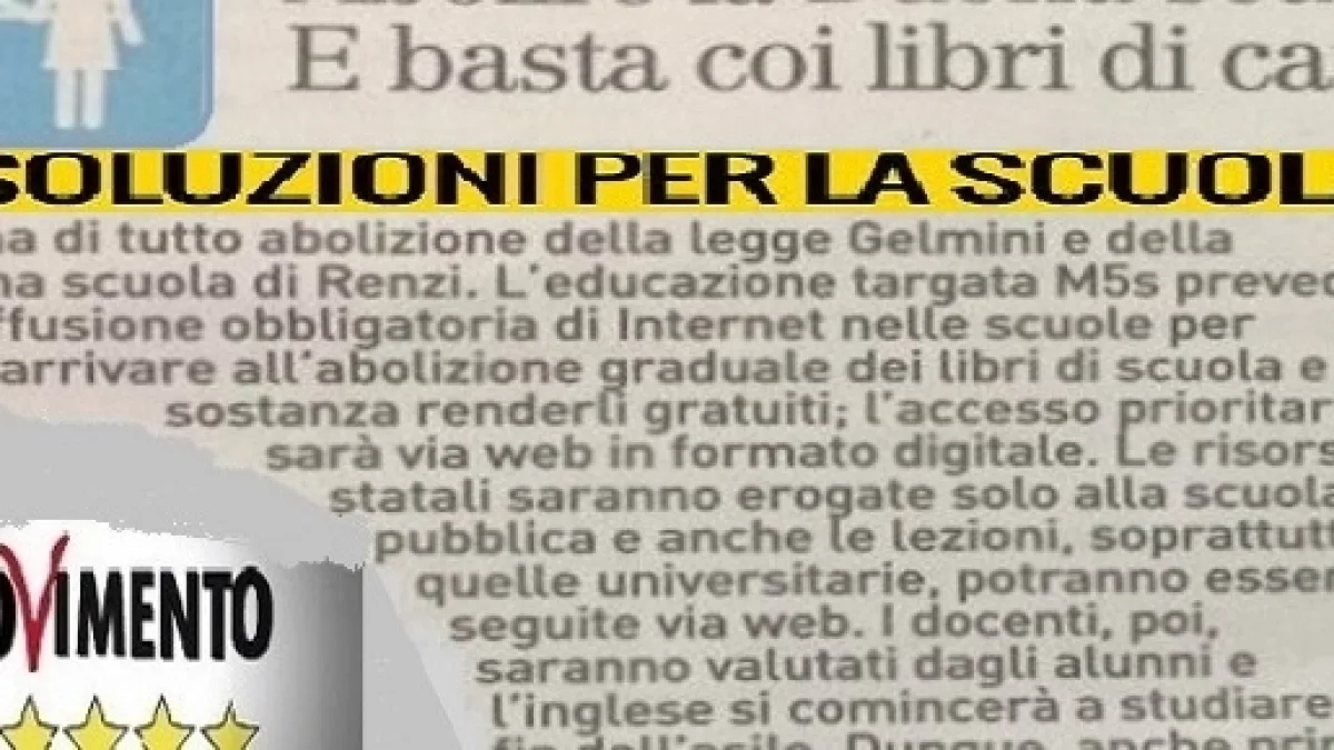 Il M5S ne ha ben sette nel suo programma diffuso a più riprese sui diversi siti di informazione quali Tecnica della Scuola e Orizzonte Scuola. Di sette soluzioni se ne riparla sul primo, dalle nuove forme di reclutamento nei ruoli per i docenti rimasti esclusi dal piano e dal concorso, fino ad arrivare a nuove alternative per l'infanzia sulle quali il governo non ha mantenuto la promessa di avviare il progetto 0-6.