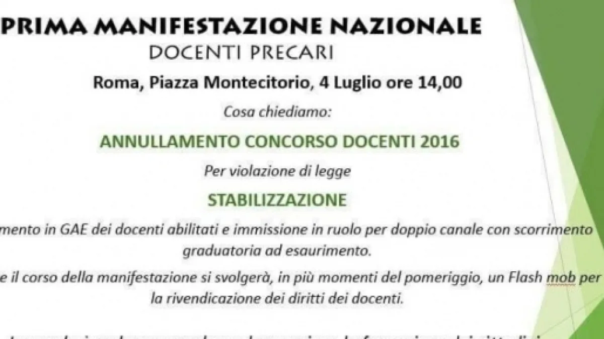 Il concorso docenti sarà uno degli argomenti principali della prima manifestazione nazionale docenti precari, organizzata per lunedì 4 luglio dal gruppo Facebook 'Azione precari #noconcorso', alle ore 14, in Piazza Montecitorio a Roma.