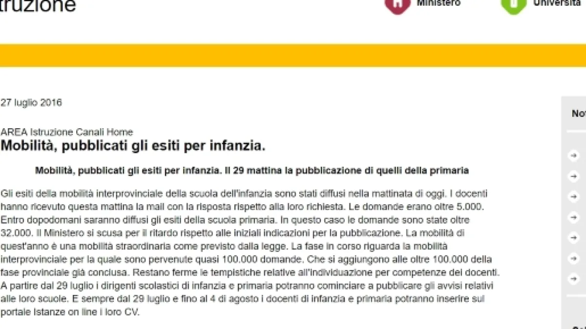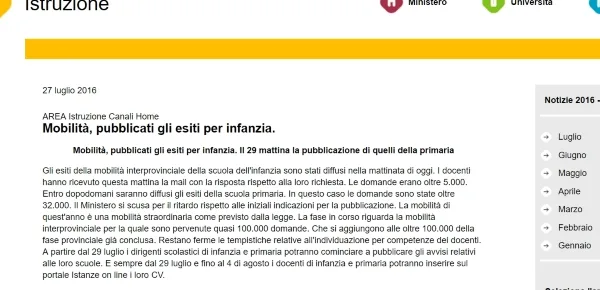 Nota Miur integrale e consultabile al link http://hubmiur.pubblica.istruzione.it/web/istruzione/dettaglio-news/-/dettaglioNews/viewDettaglio/39760/11210 per la pubblicazione degli esiti della mobilità interprovinciale della scuola dell'infanzia. Gli insegnanti interessati a conoscere la propria sede hanno ricevuto una mail con il risultato atteso ormai da due giorni.