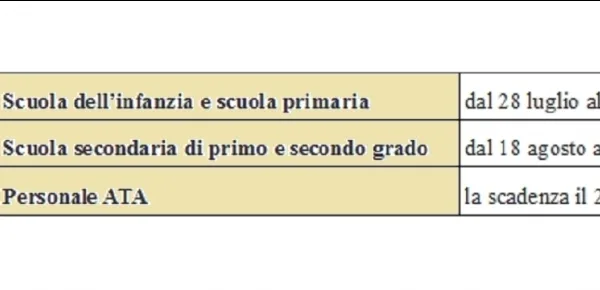 Come già vi abbiamo detto ogni ordine e grado di scuola ha una data di scadenza differente. Per quanto riguarda la scuola Primaria e dell'infanzia, le domande dovranno essere presentate dal 28 luglio al 12 agosto. Per la scuola secondaria di primo grado e di secondo grado allora le domande devono essere presentate dal 18 agosto al 28 agosto. Il personale ATA ha scadenza il 20 agosto. Tempi abbastanza brevi dunque.