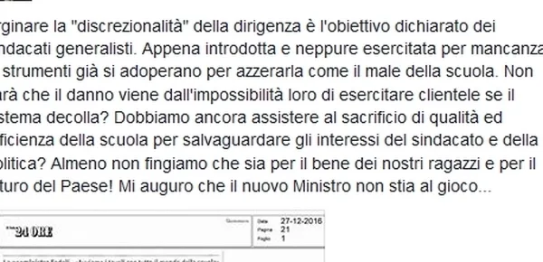 Che tipo di rapporto intende creare Valeria Fedeli tra Miur e sindacati? È tutto qui l'enigma da sciogliere, anche se la risposta potrebbe arrivare oggi stesso dopo l'incontro programmato al Ministero. La Vicepresidente dell’ANP scrive le proprie preoccupazioni su Facebook, ricordando che l'obiettivo dei sindacati è quello di arginare la "discrezionalità" della dirigenza. Sottolinea che tale discrezionalità in realtà non è stata nemmeno esercitata 'per mancanza di strumenti', ma che già si intende azzerarla.
