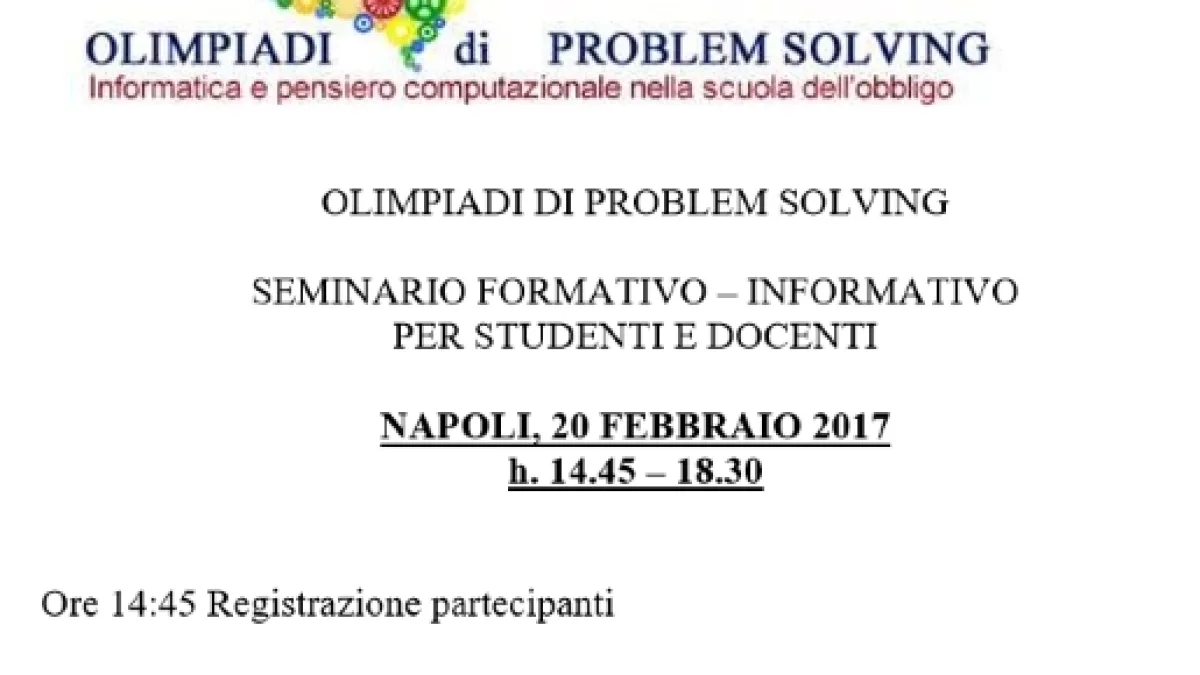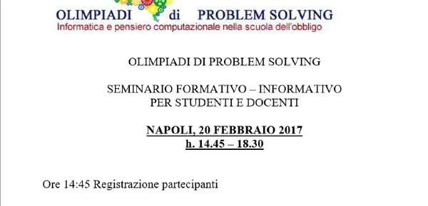 Il seminario sulle tematiche del Problem Solving si terranno il giorno 20 febbraio 2017 presso: l’I.T.I. “Augusto Righi” - Viale Kennedy, 112 – Napoli dalle h.14:45 alle h.18:30. Per poter partecipare all’evento, i Dirigenti Scolastici e i Docenti interessati dovranno formalizzare l’iscrizione entro e non oltre le h.24:00 del giorno 17 febbraio p.v. compilando il form presente sul sito olimpiadidiproblemsolving.