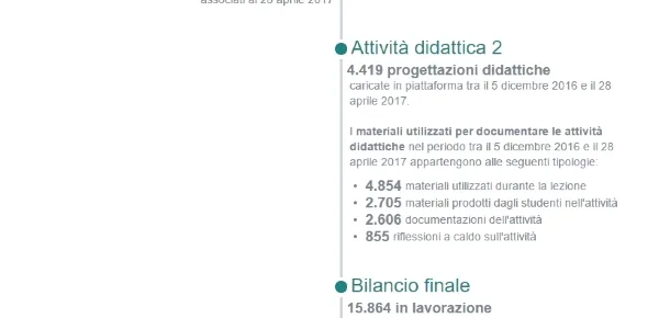 I dati di cui stiamo per informarvi sono aggiornati ad ieri 28 Aprile 2017, nello specifico è emerso che nei curriculum formativi caricati sono state inserite 53.384 esperienze pregresse e che i bilanci iniziali in lavorazione sono 25762 a fronte dei 14284 di quelli inviati. Dati particolarmente rilevanti sono emersi dall'analisi delle due attività didattiche caricate. Nel dettaglio per quando riguarda l'attività didattica 1 sono state caricate in piattaforma 8.467 progettazioni didattiche, con il caricamento di 9.738 materiali utilizzati durante la lezione