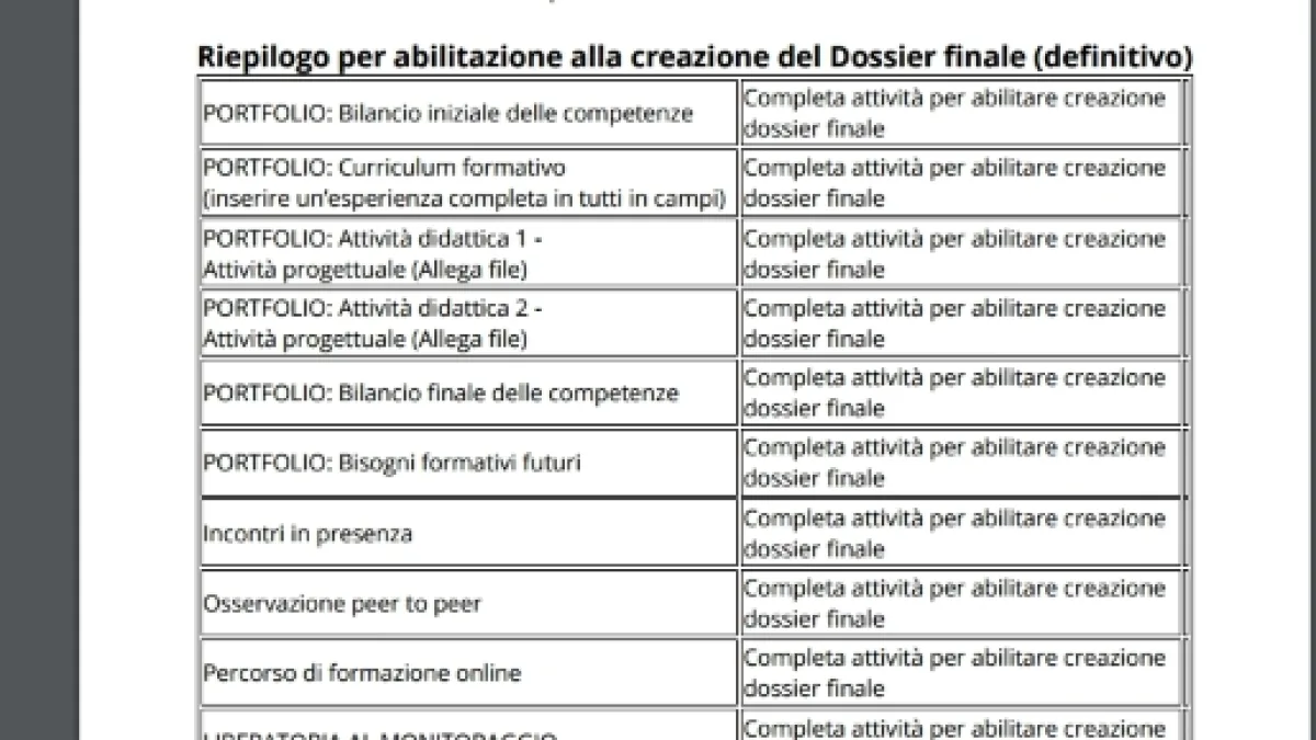 Altra domanda molto richiesta dai neoassunti è cos'è la riflessione complessiva sull'attività? Essa è la documentazione delle attività didattiche realizzate, la quale sarà inclusa nel Portfolio e diverrà parte integrante della documentazione che sarà consegnata al comitato di valutazione per la discussione finale. Le riflessioni sulla documentazione potranno essere integrate e modificate fino al momento in cui elaborerai la documentazione da presentare al comitato di valutazione per la discussione finale. Infine, vorremmo precisare che per sbloccare il download del Dossier finale, è necessario aver svolto tutte le attività corrispondenti alle voci riportate sotto la dicitura 'Riepilogo per abilitazione alla creazione del Dossier finale'.