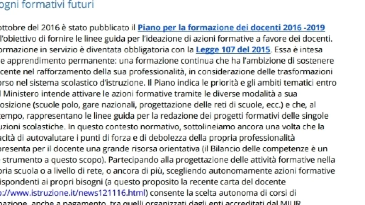 In particolare: 4. le competenze linguistiche 5. le competenze digitali 6. le competenze relative allo sviluppo di progetti di alternanza Scuola-Lavoro. In definitiva per ogni competenza dovrete selezionare la voce che più risponde alle vostre esigenze. Inoltre, nella fase conclusiva dovrete redigere un testo di massimo 2000 caratteri spazi inclusi, dando risposta alla seguente domanda quali caratteristiche vorresti avesse la formazione cui parteciperai? Per le altre informazioni sull'anno di prova vi rimandiamo alle precedenti news, inoltre per restare aggiornati premete il tasto segui.