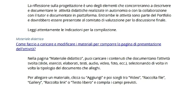Nella fase finale della progettazione vi viene chiesto di caricare un file in cui descrivete la progettazione dell’attività, indicando la successione di azioni che avete svolto (ad esempio i primi 10 minuti li ho dedicati all'introduzione della lezione ecc). Il file che potete caricare è unico e dovrà avere una dimensione massima di 7Mb (ogni ulteriore caricamento sostituirà il precedente). Vi ricordiamo che il file caricato per ciascuna attività didattica deve essere obbligatoriamente allegato al Dossier finale ed è scaricabile nella sezione “Dossier finale”. Nel caso avreste più file ( con differenti estensioni quali: pdf .doc .docx .odt .ods .txt .ppt .pptx ecc da caricare vi consigliamo di creare un file “archivio” di tipo .zip o .rar (i file possono essere compressi in tali formati mediante un software di compressione).